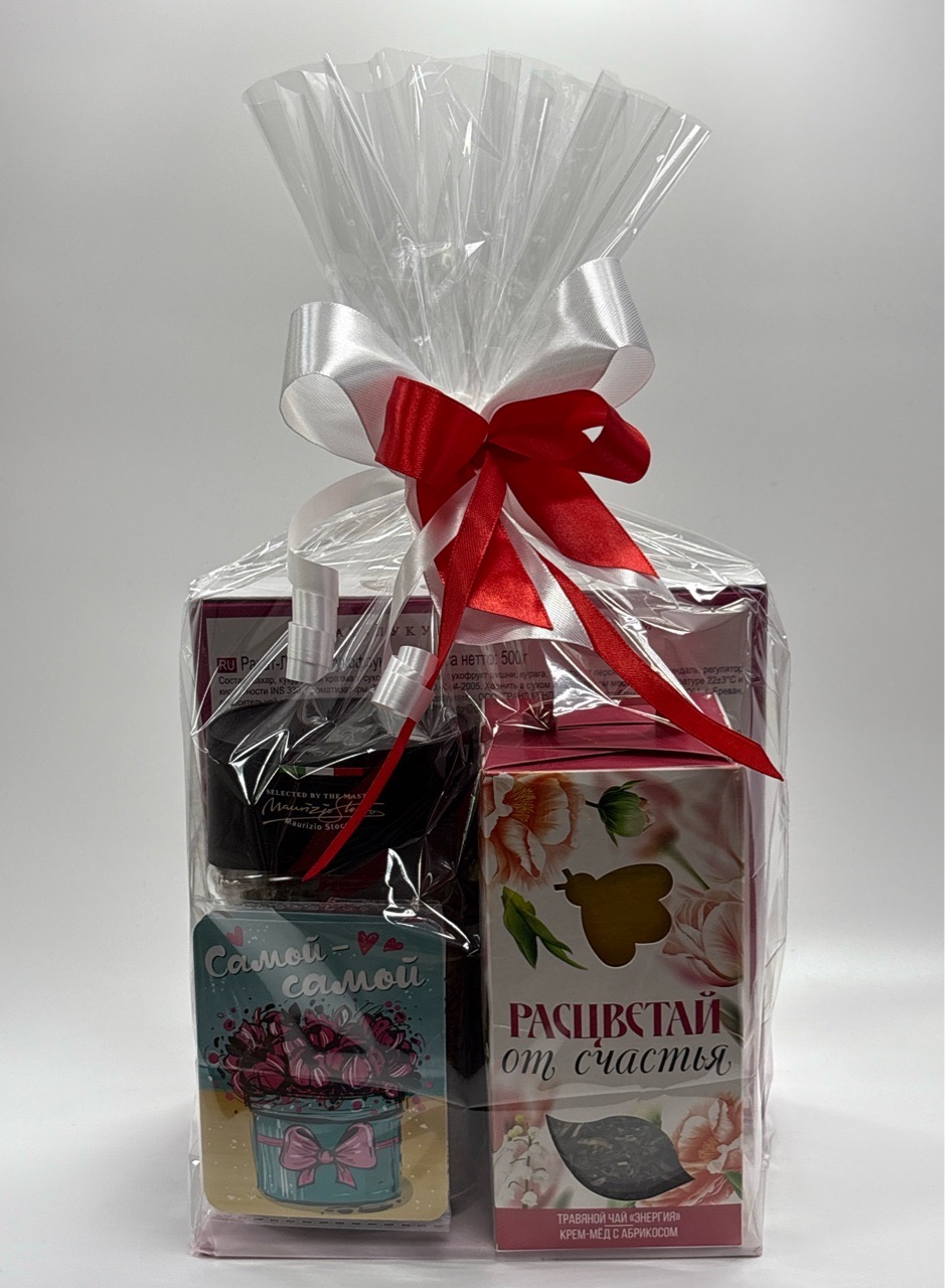 Подарочный набор 080326 арт! рахат лукум джойко 500гр\кофе фреско 100гр\чай+крем мед расцветай\открытка самой самой.