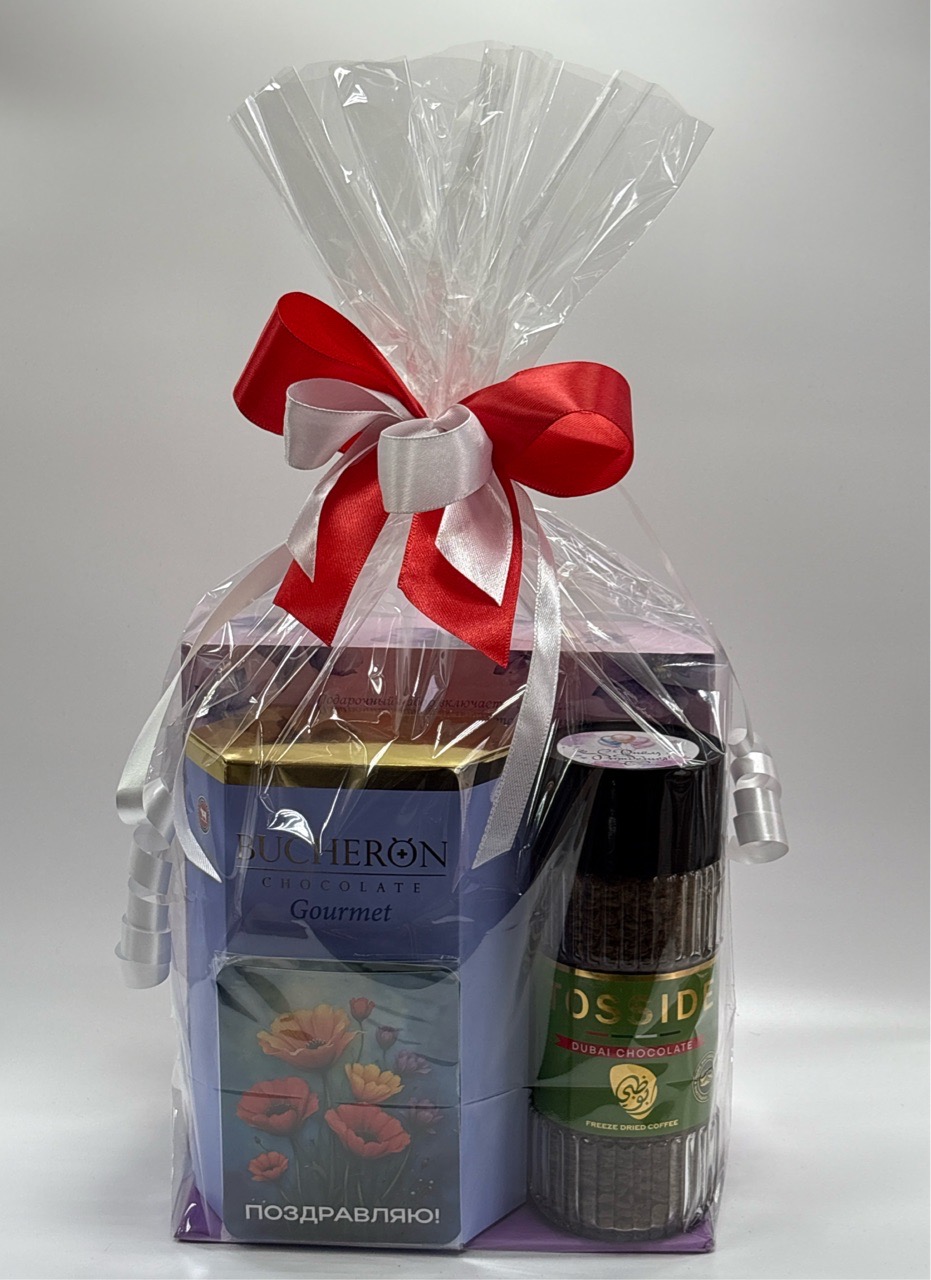 Подарочный набор 090326 арт! набор гель для душа + крем дл тела\ конфеты бушерон \кофе тоссайд\открытка с шоколадом поздравляю.